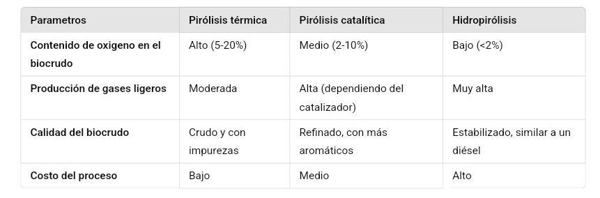 El uso de catalizadores con hidrógeno en la pirólisis permite optimizar el rendimiento del biocrudo , acercándolo a los estándares de los combustibles fósiles tradicionales y facilitando su posterior refinación o uso industrial.