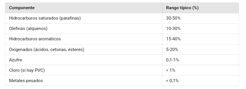 La composición química del biocrudo y el gas de pirólisis no es uniforme, ya que depende de diversos factores que afectan la degradación térmica de los plásticos. Entre los principales determinantes de esta variabilidad se encuentran el tipo de plástico de origen , las condiciones del proceso de pirólisis , la presencia de catalizadores y la naturaleza de las impurezas en los residuos plásticos.