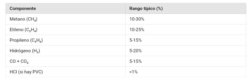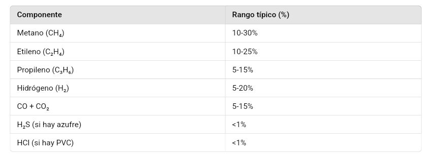 El gas generado en la pirólisis contiene hidrocarburos ligeros, hidrógeno y contaminantes. Su caracterización es fundamental para su aprovechamiento energético y petroquímico.