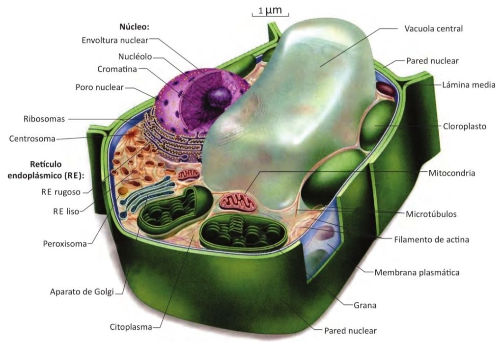 - Gran Vacuola Central: Un enorme «Almacén» lleno de agua que ayuda a mantener la presión interna (turgencia) de la célula vegetal, y también almacena nutrientes y desechos.