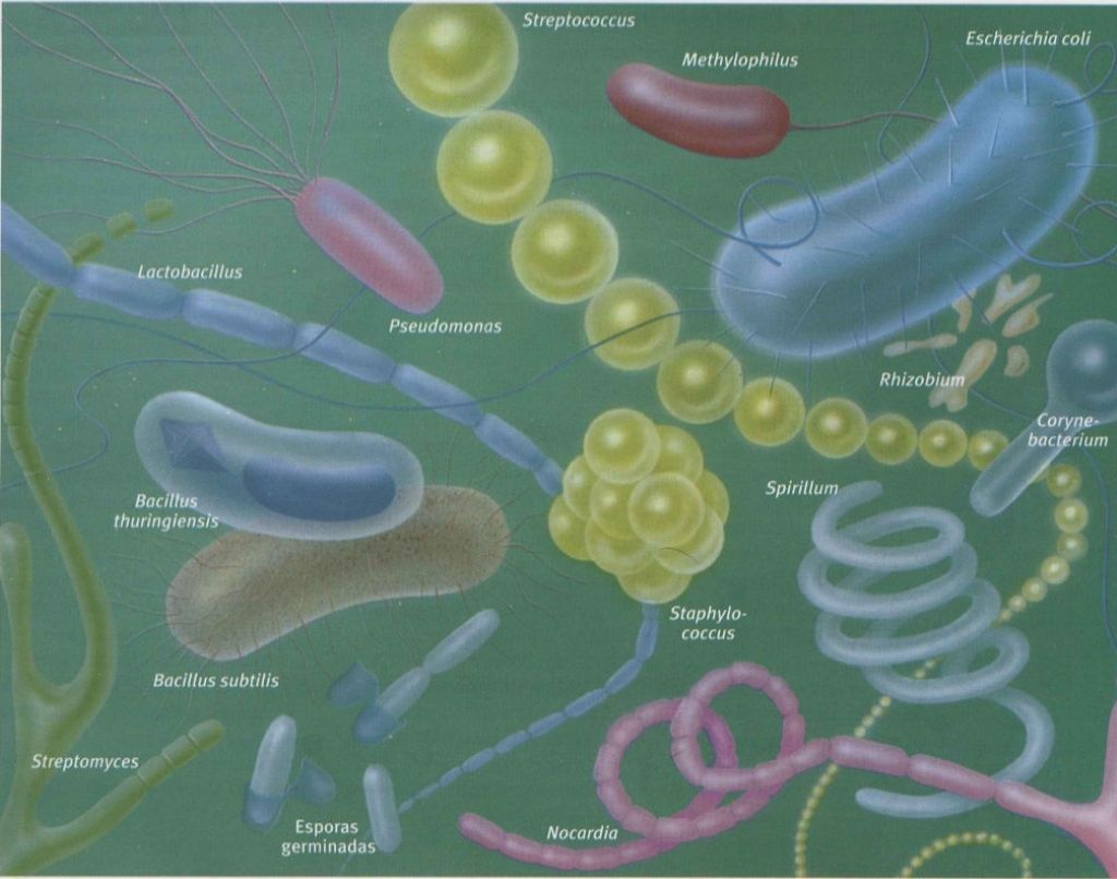 - Cómo Son: Son organismos más simples que las levaduras (procariotas), sin un núcleo celular definido, y pueden tener formas variadas: bastones (bacilos), esferas (cocos)… (Mira la variedad en la Fig 1.8).