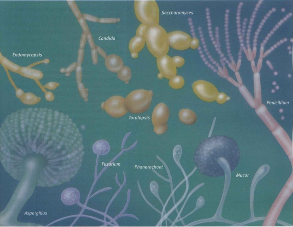 - Cómo Son: A diferencia de los anteriores, son hongos formados por muchas células (pluricelulares) que crean redes de hilos llamadas «micelio» y producen esporas, a menudo coloridas, para reproducirse. (La Fig 1.9 te da una idea).
